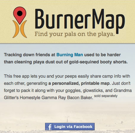 Quest’anno, per facilitare l’incontro tra amici e persone che già si conoscono, un gruppo di partecipanti ha messo a disposizione di tutti una app Facebook, la BurnerMap che permette di condividere la propria posizione in una cartina della playa – il letto di un antico lago, ora desertico, in cui si tiene il festival – creando una mappa personalizzata e stampabile.